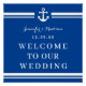 Elegante Boda Náutico de la Marina Monograma Bienvenida Poster Personalizado náutica temática "Bienvenido a nuestro Boda" poster / cartel dirigido a ser mostrado en el día de la boda de verano. Texto personalizado blanco y color de fondo azul marino. Personalizar el ancla del bote, diseño de monograma de cuerda con las iniciales de novia y novio, nombres y fecha de boda. Las franjas horizontales acentúan el diseño.