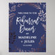 Este elegante cartel de bienvenida para la cena de ensayo en rosa oro y azul marino es perfecto para una elegante cena de ensayo de boda. El diseño presenta un impresionante marco frondoso de color rosa pálido sobre un fondo azul oscuro y está combinado con una deslumbrante tipografía cursiva. Personalice el cartel con el nombre de la novia y el novio, y la fecha.