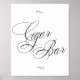 Este romántico y atemporal cartel de la mesa del "Cigar Bar" le da una elegancia sencilla a cualquier tipo de boda clásica, ducha o motivo fiesta. La plantilla de guiones de lujo incluye una brillante y hermosa caligrafía moderna en negro grabada con fondo blanco. El bonito tipo de letra con un color de fondo de personalizable facilita la adaptación a cualquier tema. Para otros colores o productos a juego, por favor visite la tienda JustFharryn Zazzle, o contacte con el diseñador, c/o Fharryn@yahoo.com Todos los derechos reservados. #zazzlemade