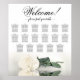 Este bonito cuadro boda consta de 17 mesas y un diseño exquisito que exhibe horizontalmente un rosa solitario de marfil de tallo largo, blanco o crema que se refleja en una piscina de agua. El título está escrito en sofisticada caligrafía de escritura y dice "¡Bienvenidos!" con los nombres de la pareja y la fecha boda en la parte inferior. La disposición de los asientos es tradicional y tiene capacidad para 170 comensales y capacidad para 10 comensales por mesa. Esta romántica, elegante e impresionante carta de asientos es un gesto encantador para saludar a sus bodas y ayudarles a encontrar sus asientos con facilidad en la recepción.
