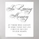 Esta señalización romántica y atemporal "En memoria amorosa: De aquellos que no pueden estar aquí hoy pero están siempre presentes en nuestros corazones" añade una simple elegancia a cualquier recepción de boda clásica, ducha o motivo de fiesta. La plantilla de lujo con letra script presenta una caligrafía negra moderna caprichosa y hermosa sobre fondo blanco. La fuente encantadora con un color de fondo personalizable hace que sea fácil de encajar en cualquier tema. Para otros colores o productos coincidentes, por favor visite la tienda JustFharryn Zazzle, o póngase en contacto con el diseñador, c/o Fharryn@yahoo.com Todos los derechos reservados. #zazzlemade