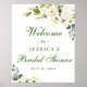 Dale la bienvenida a tus invitados a tu boda con Rosas Blancas Cartel de Bienvenida Despedida de Soltera Floral Verde, con exuberante vegetación botánica de acuarela y flores blancas, con "bienvenidos a nuestro feliz para siempre", sus nombres y fecha de la boda en una mezcla elegante de tipos de letra modernos y caligráficos a mano.