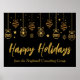 Personalizar a tu moda poster de fiesta corporativa de vacaciones con este elegante guión cursivo de oro bajo una serie de adornos navideños. La elegante tipografía sobre un fondo negro moderno le da un toque elegante a esta firma de Navidades de negocios personalizados para su empresa.