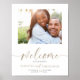 Elegante y moderna señal de bienvenida para su día especial. Chic caligrafía dorada en un estilo escrito a mano, colocado sobre un fondo blanco, añade un toque de lujo a esta plantilla única. Personalice este diseño con sus datos personales.