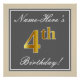 Este diseño de cartel de fiesta de cumpleaños simple y elegante presenta un mensaje personalizado como "Nombre-Aquí está su 4º cumpleaños" (con el "4º" que tiene un aspecto de color dorado falso/imitación) dentro de un área cuadrada de color gris que presenta un simple contorno de borde. El nombre está en un texto tipo letra cursiva de color blanco elegante y se puede personalizar. Un cartel de fiesta de cumpleaños personalizado como este podría quizás ser utilizado como decoración en una fiesta que se celebra para alguien que está celebrando su cuarto cumpleaños. [~Z0000241]