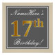 Este sencillo y elegante diseño de poster para fiestas de cumpleaños incluye un mensaje personalizado como "¡Nombre, este es el cumpleaños número 17!" (el "17" tiene un aspecto de color falso/imitación de oro) dentro de un área cuadrada de color gris con un sencillo contorno fronterizo. El nombre se encuentra en un texto elegante de color blanco tipo script, y se puede personalizar. Un poster de fiesta de cumpleaños personalizado como este podría ser usado como decoración en un fiesta que está siendo retenido por alguien que está celebrando su decimoséptimo cumpleaños. [~Z0000241]