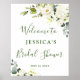 Bienvenidos invitados a su boda con Cartel de Bienvenida para Despedida de Soltera con Rosas Blancas y Follaje Floral, con exuberante follaje botánico acuarela y flores blancas, con "bienvenidos a nuestro siempre después", sus nombres y fecha de la boda en una mezcla elegante de tipografías modernas de bloque y caligrafía manuscrita.
