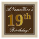 Este sencillo y elegante diseño de poster para fiestas de cumpleaños incluye un mensaje personalizado como "¡El cumpleaños 19 de ANameHere!" (el "decimonoveno" tiene un aspecto de color falso/imitación dorado) dentro de un área cuadrada de color marrón con un sencillo contorno fronterizo. El nombre se encuentra en un texto elegante de color blanco tipo script, y se puede personalizar. Un poster de fiesta de cumpleaños personalizado como este podría ser usado como decoración en un fiesta que está siendo retenido por alguien que está celebrando su decimonoveno cumpleaños. [~Z0000240]