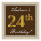 Este sencillo y elegante diseño de poster de cumpleaños incluye un mensaje personalizado como "¡24 cumpleaños de Andrew!" (el "24" tiene un aspecto de color falso/imitación de oro) dentro de un área cuadrada de color marrón con un sencillo contorno fronterizo. El nombre se encuentra en un texto elegante de color blanco tipo script, y se puede personalizar. Un poster de fiesta de cumpleaños personalizado como este podría ser usado como decoración en un fiesta que está siendo retenido por alguien que está celebrando su vigésimo cuarto cumpleaños. [~Z0000240]