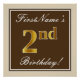 Este sencillo y elegante diseño de poster para fiestas de cumpleaños incluye un mensaje personalizado como "¡Segundo cumpleaños de FirstName!" (con el "2º" con un aspecto de color falso/imitación de oro) dentro de un área cuadrada de color marrón con un simple contorno fronterizo. El nombre se encuentra en un texto elegante de color blanco tipo script, y se puede personalizar. Un poster de fiesta de cumpleaños personalizado como este podría ser usado como decoración en un fiesta que está siendo retenido por alguien que está celebrando su segundo cumpleaños. [~Z0000240]