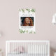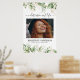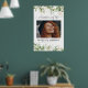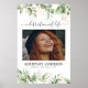 Impresión conmemorativa con una gran foto de la persona que recuerda, elegantes hojas de eucalipto botánico verde acuarela, acentos florales dorados, su nombre y fechas de nacimiento y fallecimiento.