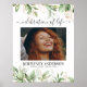 Póster de espuma de bienvenida funeraria con una gran foto de la persona que recuerda, elegantes hojas de eucalipto botánico acuarela verde, acentos florales dorados, su nombre y fechas de nacimiento y muerte.