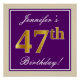 Este diseño de cartel de fiesta de cumpleaños simple y elegante presenta un mensaje personalizado como "¡El cumpleaños número 47 de Jennifer!" (con el "47º" con un aspecto de color dorado falso/imitación) dentro de un área cuadrada de color púrpura con un simple contorno de borde. El nombre está en un texto tipo escritura de color blanco elegante y se puede personalizar. Un cartel de fiesta de cumpleaños personalizado como este podría ser utilizado como decoración en una fiesta que se celebra para alguien que está cumpliendo cuarenta y siete años. [~Z0000238]