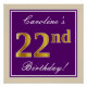 Este sencillo y elegante diseño de poster de cumpleaños incluye un mensaje personalizado como "¡El vigésimo segundo cumpleaños de Caroline!" (con el "22º" con un aspecto de color falso/imitación de oro) dentro de un área cuadrada de color morado con un sencillo contorno fronterizo. El nombre se encuentra en un texto elegante de color blanco tipo script, y se puede personalizar. Un poster de fiesta de cumpleaños personalizado como este podría ser usado como decoración en un fiesta que está siendo retenido por alguien que está celebrando su vigésimo segundo cumpleaños. [~Z0000238]