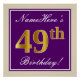 Póster Elegante, morado, falso oro 49 cumpleaños + nombre