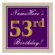 Este sencillo y elegante diseño de poster para fiestas de cumpleaños incluye un mensaje personalizado como "¡El 53 aniversario de Name Here's 53rd Birthday!" (con el "53rd" con un toque de color falso/imitación dorado) dentro de un área cuadrada de color morado con un sencillo contorno fronterizo. El nombre se encuentra en un texto elegante de color blanco tipo script, y se puede personalizar. Un poster de fiesta de cumpleaños personalizado como este podría ser usado como decoración en un fiesta que está siendo retenido por alguien que está celebrando su cincuenta tercer cumpleaños. [~Z0000238]