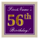 Este sencillo y elegante diseño de poster de cumpleaños incluye un mensaje personalizado como "¡56º cumpleaños de FirstName!" (el "56º" tiene un aspecto de color falso/imitación de oro) dentro de un área cuadrada de color morado con un sencillo contorno de borde. El nombre se encuentra en un texto elegante de color blanco tipo script, y se puede personalizar. Un poster de fiesta de cumpleaños personalizado como este podría ser usado como decoración en un fiesta que está siendo retenido por alguien que está celebrando su 56º cumpleaños. [~Z0000238]