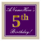 Este sencillo y elegante diseño de poster de cumpleaños incluye un mensaje personalizado como "¡El quinto cumpleaños de ANameHere!" (el quinto tiene un aspecto de color falso/imitación de oro) dentro de un área cuadrada de color morado con un sencillo contorno fronterizo. El nombre se encuentra en un texto elegante de color blanco tipo script, y se puede personalizar. Un poster de fiesta de cumpleaños personalizado como este podría ser usado como decoración en un fiesta que está siendo retenido por alguien que está celebrando su quinto cumpleaños. [~Z0000238]