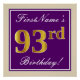Este sencillo y elegante diseño de poster para fiestas de cumpleaños incluye un mensaje personalizado como "¡Cumpleaños 93 de FirstName!" (el "93" tiene un aspecto de color falso/imitación de oro) dentro de un área cuadrada de color morado con un simple contorno de borde. El nombre se encuentra en un texto elegante de color blanco tipo script, y se puede personalizar. Un poster de fiesta de cumpleaños personalizado como este podría ser usado como decoración en un fiesta que está siendo retenido por alguien que está celebrando su noventa tercer cumpleaños. [~Z0000238]