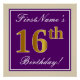 Este sencillo y elegante diseño de poster de cumpleaños incluye un mensaje personalizado como "¡16º cumpleaños de FirstName!" (el "16º" tiene un aspecto de color falso/imitación de oro) dentro de un área cuadrada de color morado con un sencillo contorno de borde. El nombre se encuentra en un texto elegante de color blanco tipo script, y se puede personalizar. Un poster de fiesta de cumpleaños personalizado como este podría ser usado como decoración en un fiesta que está siendo retenido por alguien que está celebrando su decimosexto cumpleaños. [~Z0000238]