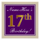 Este sencillo y elegante diseño de poster para fiestas de cumpleaños incluye un mensaje personalizado como "¡Cumpleaños 17!" (el "17" tiene un aspecto de color falso/imitación de oro) dentro de un área cuadrada de color morado con un simple contorno fronterizo. El nombre se encuentra en un texto elegante de color blanco tipo script, y se puede personalizar. Un poster de fiesta de cumpleaños personalizado como este podría ser usado como decoración en un fiesta que está siendo retenido por alguien que está celebrando su decimoséptimo cumpleaños. [~Z0000238]