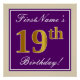 Este sencillo y elegante diseño de poster para fiestas de cumpleaños incluye un mensaje personalizado como "¡Cumpleaños 19 de FirstName!" (el "19" tiene un aspecto de color falso/imitación de oro) dentro de un área cuadrada de color morado con un sencillo contorno de borde. El nombre se encuentra en un texto elegante de color blanco tipo script, y se puede personalizar. Un poster de fiesta de cumpleaños personalizado como este podría ser usado como decoración en un fiesta que está siendo retenido por alguien que está celebrando su decimonoveno cumpleaños. [~Z0000238]