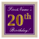 Este sencillo y elegante diseño de poster para fiestas de cumpleaños incluye un mensaje personalizado como "¡Cumpleaños 20 de FirstName!" (con el "20" con un toque de color falso/imitación de oro) dentro de un área cuadrada de color morado con un sencillo contorno de borde. El nombre se encuentra en un texto elegante de color blanco tipo script, y se puede personalizar. Un poster de fiesta de cumpleaños personalizado como este podría ser usado como decoración en un fiesta que se celebra por alguien que está celebrando su vigésimo cumpleaños. [~Z0000238]