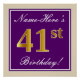 Este sencillo y elegante diseño de poster para fiestas de cumpleaños incluye un mensaje personalizado como "¡El 41 aniversario de Name-Here!" (el 41 tiene un aspecto de color falso/imitación de oro) dentro de un área cuadrada de color morado con un sencillo contorno fronterizo. El nombre se encuentra en un texto elegante de color blanco tipo script, y se puede personalizar. Un poster de fiesta de cumpleaños personalizado como este podría ser usado como decoración en un fiesta que está siendo retenido por alguien que está celebrando su cuarenta primer cumpleaños. [~Z0000238]