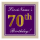 Este sencillo y elegante diseño de poster para fiestas de cumpleaños incluye un mensaje personalizado como "¡Cumpleaños 70 de FirstName!" (con el "70th" con un aspecto de color falso/imitación de oro) dentro de un área cuadrada de color morado con un simple contorno fronterizo. El nombre se encuentra en un texto elegante de color blanco tipo script, y se puede personalizar. Un poster de fiesta de cumpleaños personalizado como este podría ser usado como decoración en un fiesta que está siendo retenido por alguien que está celebrando su septuagésimo cumpleaños. [~Z0000238]