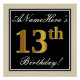 Este sencillo y elegante diseño de poster de cumpleaños incluye un mensaje personalizado como "¡El 13 aniversario de ANameHere's 13th Birthday!" (el "13th" tiene un aspecto de color falso/imitación dorado) dentro de un área cuadrada de color negro con un simple contorno fronterizo. El nombre se encuentra en un texto elegante de color blanco tipo script, y se puede personalizar. Un poster de fiesta de cumpleaños personalizado como este podría ser usado como decoración en un fiesta que está siendo retenido por alguien que está celebrando su decimotercer cumpleaños. [~Z0000236]