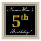 Este sencillo y elegante diseño de poster para fiestas de cumpleaños incluye un mensaje personalizado como "¡Nombre, este es el quinto cumpleaños!" (el "quinto" tiene un aspecto de color falso/imitación de oro) dentro de un área cuadrada de color negro con un simple contorno fronterizo. El nombre se encuentra en un texto elegante de color blanco tipo script, y se puede personalizar. Un poster de fiesta de cumpleaños personalizado como este podría ser usado como decoración en un fiesta que está siendo retenido por alguien que está celebrando su quinto cumpleaños. [~Z0000236]