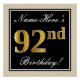 Este sencillo y elegante diseño de poster para fiestas de cumpleaños incluye un mensaje personalizado como "¡El 92 aniversario de Name-Here!" (con el "92" con un toque de color falso/imitación dorado) dentro de un área cuadrada de color negro con un sencillo contorno fronterizo. El nombre se encuentra en un texto elegante de color blanco tipo script, y se puede personalizar. Un poster de fiesta de cumpleaños personalizado como este podría ser usado como decoración en un fiesta que está siendo retenido por alguien que está celebrando su cumpleaños noventa. [~Z0000236]