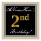 Este sencillo y elegante diseño de poster para fiestas de cumpleaños incluye un mensaje personalizado como "¡El segundo cumpleaños de ANameHere!" (con el "segundo" con un aspecto de color falso/imitación de oro) dentro de un área cuadrada de color negro con un simple contorno fronterizo. El nombre se encuentra en un texto elegante de color blanco tipo script, y se puede personalizar. Un poster de fiesta de cumpleaños personalizado como este podría ser usado como decoración en un fiesta que está siendo retenido por alguien que está celebrando su segundo cumpleaños. [~Z0000236]