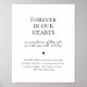 Elegante boda "Para siempre en nuestros corazones" honrará y recordará a sus seres queridos que no pudieron estar en su boda. La señalización elegante y boda es moderna con un toque de escritura clásica. El tamaño predeterminado es de 8" x 10", pero se puede redimensionar para el tamaño deseado. Puede agregar elementos o cambiar el color para complementar la configuración de la tabla. Muéstralo en un marco o se puede pegar en una pared o puerta. Personalizar con la herramienta de personalización. Son las pequeñas cosas las que hacen especial a tu boda. © diseño de obras de arte por Beautifully Resumen