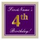 Este sencillo y elegante diseño de poster de cumpleaños incluye un mensaje personalizado como "¡El cuarto cumpleaños de FirstName!" (con el "cuarto" con un toque de color falso/imitación de oro) dentro de un área cuadrada de color morado con un simple contorno de borde. El nombre se encuentra en un texto elegante de color blanco tipo script, y se puede personalizar. Un poster de fiesta de cumpleaños personalizado como este podría ser usado como decoración en un fiesta que está siendo retenido por alguien que está celebrando su cuarto cumpleaños. [~Z0000238]