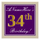 Este sencillo y elegante diseño de poster de cumpleaños incluye un mensaje personalizado como "¡El cumpleaños 34 de ANameHere's 34th!" (el "34th" tiene un aspecto de color falso/imitación dorado) dentro de un área cuadrada de color morado con un simple contorno fronterizo. El nombre se encuentra en un texto elegante de color blanco tipo script, y se puede personalizar. Un poster de fiesta de cumpleaños personalizado como este podría ser usado como decoración en un fiesta que está siendo retenido por alguien que está celebrando su 34 cumpleaños. [~Z0000238]