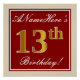 Este sencillo y elegante diseño de poster de cumpleaños incluye un mensaje personalizado como "¡El 13 aniversario de ANameHere's 13th Birthday!" (el "13th" tiene un aspecto de color falso/imitación dorado) dentro de un área cuadrada de color rojo con un simple contorno fronterizo. El nombre se encuentra en un texto elegante de color blanco tipo script, y se puede personalizar. Un poster de fiesta de cumpleaños personalizado como este podría ser usado como decoración en un fiesta que está siendo retenido por alguien que está celebrando su decimotercer cumpleaños. [~Z0000234]