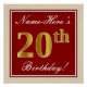 Este sencillo y elegante diseño de poster para fiestas de cumpleaños incluye un mensaje personalizado como "¡20 cumpleaños!" (el "20" tiene un aspecto falso/imitación de color dorado) dentro de un área cuadrada de color rojo con un sencillo contorno fronterizo. El nombre se encuentra en un texto elegante de color blanco tipo script, y se puede personalizar. Un poster de fiesta de cumpleaños personalizado como este podría ser usado como decoración en un fiesta que se celebra por alguien que está celebrando su vigésimo cumpleaños. [~Z0000234]