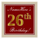 Este sencillo y elegante diseño de poster para fiestas de cumpleaños incluye un mensaje personalizado como "¡Nombre, 26 cumpleaños!" (el "26" tiene un aspecto de color falso/imitación de oro) dentro de un área cuadrada de color rojo con un simple contorno fronterizo. El nombre se encuentra en un texto elegante de color blanco tipo script, y se puede personalizar. Un poster de fiesta de cumpleaños personalizado como este podría ser usado como decoración en un fiesta que está siendo retenido por alguien que está celebrando su vigésimo sexto cumpleaños. [~Z0000234]