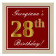 Este sencillo y elegante diseño de poster de cumpleaños incluye un mensaje personalizado como "¡Cumpleaños 28 de Georgiana!" (el "28" tiene un aspecto de color falso/imitación de oro) dentro de un área cuadrada de color rojo con un simple contorno fronterizo. El nombre se encuentra en un texto elegante de color blanco tipo script, y se puede personalizar. Un poster de fiesta de cumpleaños personalizado como este podría ser usado como decoración en un fiesta que está siendo retenido por alguien que está celebrando su vigésimo octavo cumpleaños. [~Z0000234]