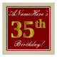 Este sencillo y elegante diseño de poster de cumpleaños incluye un mensaje personalizado como "¡El cumpleaños 35 de ANameHere's 35th!" (el "35th" tiene un aspecto de color falso/imitación dorado) dentro de un área cuadrada de color rojo con un sencillo contorno fronterizo. El nombre se encuentra en un texto elegante de color blanco tipo script, y se puede personalizar. Un poster de fiesta de cumpleaños personalizado como este podría ser usado como decoración en un fiesta que está siendo retenido por alguien que está celebrando su 35º cumpleaños. [~Z0000234]