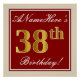 Este sencillo y elegante diseño de poster para fiestas de cumpleaños incluye un mensaje personalizado como "¡El cumpleaños 38 del ANameHere!" (el "38" tiene un aspecto de color falso/imitación dorado) dentro de un área cuadrada de color rojo con un sencillo contorno fronterizo. El nombre se encuentra en un texto elegante de color blanco tipo script, y se puede personalizar. Un poster de fiesta de cumpleaños personalizado como este podría ser usado como decoración en un fiesta que está siendo retenido por alguien que está celebrando su 38º cumpleaños. [~Z0000234]