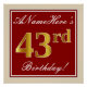 Este sencillo y elegante diseño de poster para fiestas de cumpleaños incluye un mensaje personalizado como "¡El 43 aniversario de ANameHere's 43rd Birthday!" (con el "43rd" con un toque de color falso/imitación dorado) dentro de un área cuadrada de color rojo con un sencillo contorno fronterizo. El nombre se encuentra en un texto elegante de color blanco tipo script, y se puede personalizar. Un poster de fiesta de cumpleaños personalizado como este podría ser usado como decoración en un fiesta que está siendo retenido por alguien que está celebrando su cuarenta y tres años. [~Z0000234]