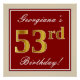 Este sencillo y elegante diseño poster de la fiesta de cumpleaños incluye un mensaje personalizado como "¡53 cumpleaños de Georgiana!" (el "53" tiene un aspecto de color falso/imitación de oro) dentro de un área cuadrada de color rojo con un simple contorno fronterizo. El nombre se encuentra en un texto elegante de color blanco tipo script, y se puede personalizar. Un poster de fiesta de cumpleaños personalizado como este podría ser usado como decoración en un fiesta que está siendo retenido por alguien que está celebrando su cincuenta tercer cumpleaños. [~Z0000234]