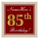 Este sencillo y elegante diseño de poster para fiestas de cumpleaños incluye un mensaje personalizado como "¡Nombre, cumpleaños número 85!" (el "85" tiene un aspecto de color falso/imitación de oro) dentro de un área cuadrada de color rojo con un sencillo contorno fronterizo. El nombre se encuentra en un texto elegante de color blanco tipo script, y se puede personalizar. Un poster de fiesta de cumpleaños personalizado como este podría ser usado como decoración en un fiesta que está siendo retenido por alguien que está celebrando su 85º cumpleaños. [~Z0000234]