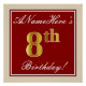 Este sencillo y elegante diseño de poster para fiestas de cumpleaños incluye un mensaje personalizado como "¡El octavo cumpleaños de ANameHere!" (con el "octavo" con un aspecto de color falso/imitación de oro) dentro de un área cuadrada de color rojo con un simple contorno fronterizo. El nombre se encuentra en un texto elegante de color blanco tipo script, y se puede personalizar. Un poster de fiesta de cumpleaños personalizado como este podría ser usado como decoración en un fiesta que está siendo retenido por alguien que está celebrando su octavo cumpleaños. [~Z0000234]