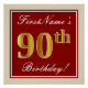 Este sencillo y elegante diseño de poster para fiestas de cumpleaños incluye un mensaje personalizado como "¡Cumpleaños 90 de FirstName!" (con el "90" con un toque de color falso/imitación de oro) dentro de un área cuadrada de color rojo con un sencillo contorno fronterizo. El nombre se encuentra en un texto elegante de color blanco tipo script, y se puede personalizar. Un poster de fiesta de cumpleaños personalizado como este podría ser usado como decoración en un fiesta que está siendo retenido por alguien que está celebrando su cumpleaños número noventa. [~Z0000234]