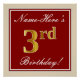 Este sencillo y elegante diseño de poster para fiestas de cumpleaños incluye un mensaje personalizado como "¡El tercer cumpleaños es el nombre!" (el tercer día tiene un aspecto de color falso/imitación de oro) dentro de un área cuadrada de color rojo con un simple contorno fronterizo. El nombre se encuentra en un texto elegante de color blanco tipo script, y se puede personalizar. Un poster de fiesta de cumpleaños personalizado como este podría ser usado como decoración en un fiesta que está siendo retenido por alguien que está celebrando su tercer cumpleaños. [~Z0000234]