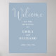 Este elegante y polvoriento signo de bienvenida de boda de guiones azul se puede personalizar con toda la información especial del día de la boda. Diseñado por Thisisnotme©
