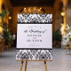 Elegante signo de bienvenida de la boda blanca y blanca de Damasco
